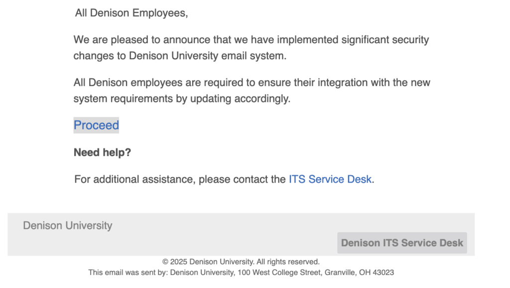Denison will never ask for your password by email, by Google Form, or by calling. If you receive such a message, please forward it to our reporting mailbox at isitsafe@denison.edu. If you have accidentally interacted with a message or think you might’ve sent credentials, immediately contact the Service Desk.